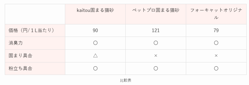 3つの猫砂について、それぞれ表にまとめました。